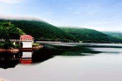 水库大坝 坝址位于六峰湖北部,大坝全长280米,坝下有水力发电斩站,总装机容量750千瓦。气势宏伟,夜晚灯火通明,场面壮观。大坝右侧为无闸控制开敞式溢洪道,上部设有一座单跨40米双曲拱桥,是通往大坝的交通枢纽。输水洞位于大坝右侧,最大泄喷水量为146立方米/秒。